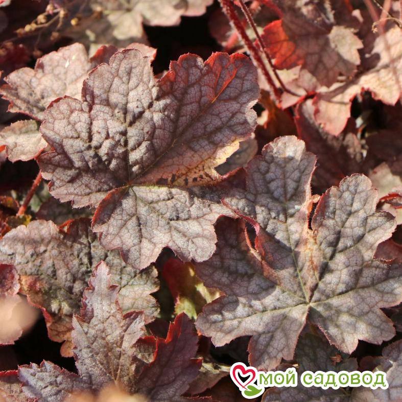Это вечнозеленое многолетнее растение из семейства Саксифражевые (Saxifragaceae). Листья бархатистые, глубоко рассеченные, пурпурного или шоколадно-фиолетового цвета с серебристым напылением. Собрана листва в плотные прикорневые розетки. Цветение длится с июня по август. Куст достигает в ширину 40 см, а в высоту – 30 см.