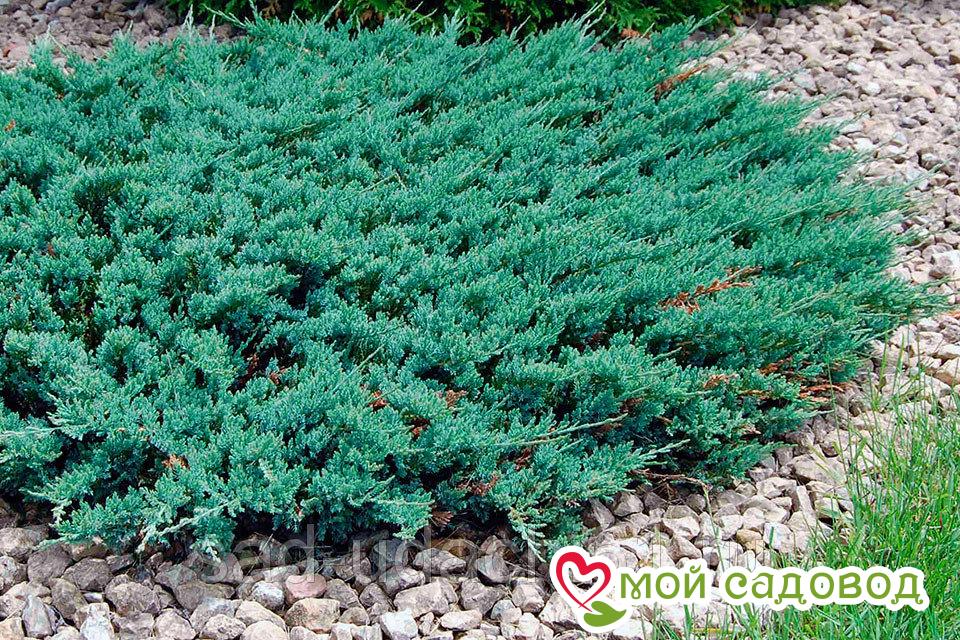 Можжевельник горизонтальный Блю Чип Этот сорт выведен из растений канадской и северноамериканской селекции. Он одновременно и красивый, и неприхотливый, и очень выносливый. В 2004 году можжевельник горизонтальный Блю Чип признан на международной выставке наилучшим декоративным сортом. Родиной хвойника считается Монголия, Япония и Китай. В целом можжевельник хорошо себя чувствует и размножается на всех широтах — от северных до южных. Ботаническое описание Можжевельник горизонтальный Блю Чип – низкорослый, двудомный, прижатый к почве кустарник. Как и многие сородичи, многолетник растёт очень медленно. В среднем годовой прирост составляет до 10 см. Взрослые экземпляры вырастают до 1,5 м в ширину и 20 см в высоту. Крона у кустарника плотная, распростёртой формы, размером до 2 м. Скелетные ветви длинные, стелющиеся, создающие густой зелёный ковёр. Концы побегов немного приподняты вверх. Хвоя чешуевидная, игольчатая, длиной 3 – 5 мм, с колючим остриём. Окрас у неё сизо-зелёный. В весенний период хвоя становится голубовато-сизой, а к зиме лиловой и буреющей. Особенно эффектно смотрятся молодые побеги: весной они ярко-голубого оттенка. С приходом осени хвоя приобретает фиолетовый отлив. Семена – чёрные шишкоягоды шаровидной формы, с сизым налётом, диаметром 5 – 6 мм. Применение Можжевельник горизонтальный Блю Чип сажают на приусадебных участках, альпийских горках, альпинария и каменистых садах. Эта культура достойно украсит балконы, открытые лоджии, крыши домов и веранды. Также она может использоваться в качестве почвопокровного растения. Некоторые дизайнеры применяют хвойник при создании рокария, озеленении можжевеловых газонов и берегов искусственных водоёмов. Кустарник востребован ещё и потому, что является мощным обеззараживателем воздуха. Он уничтожает патогенные микроорганизмы и очищает атмосферу в радиусе до 10 м. Благодаря сильному корневищу, которое активно развивается в супесчаниках, можжевельник поможет укрепить грунты, склонные к оползанию. Агротехника Можжевельник горизонтальный Блю Чип – светолюбивая культура. Однако лёгкую полутень он тоже переносит. Не смотря на то, что хвойник засухоустойчив, полив ему нужен регулярный. К почвам абсолютно не требователен, но плохо реагирует на засоление грунта и застойные воды. Выращивать саженцы лучше в супесчаниках и суглинках, которые отвечают следующим требованиям: с нейтральной и слабокислой реакцией; лёгкие и рыхлые; увлажнённые, но при этом хорошо дренированные. Чтобы поддерживать влажность субстрата и предупредить застой воды на дне лунки укладывают слой битого кирпича, щебня или мелкой гальки. Область вокруг ствола мульчируют древесными опилками, перегноем или торфом. В последующие годы, разрастаясь вширь, крона хвойника будет самостоятельно защищать корневище от пересыхания. Можжевельник горизонтальный Блю Чип не требует обязательной обрезки. Но при необходимости формировки кроны и санитарной стрижки легко переносит эти манипуляции. Преимущества можжевельника горизонтального Блю Чип В питомнике Садовод продаётся рассада диаметром 30 – 40 см, в контейнерах объёмом 3 л. Купить такие растения стоит по нескольким причинам. Например, потому, что они отличаются хорошей приживаемостью. Также сорт обладает следующими особенностями: простота в уходе; живописный вне