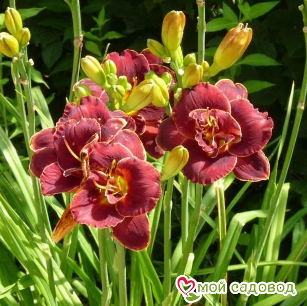 Многолетний гибрид принадлежит к группе Дабл, семейства Ксанторриевые. Выведен он в 1998 году. Растение активно применяется в озеленении участка. Оно неприхотливо в уходе и отлично сочетается с другими «обитателями» сада. Купить недорого качественный посадочный материал можно в магазине «Мой садовод». Как выглядит растение? Высота взрослого экземпляра составляет 65 – 80 см. Стебли тонкие, но при этом довольно мощные. Листья размещены у основания куста. Они продолговатой формы, глубокого зеленого цвета. Период цветения наступает в первой половине июля и длится до августа. Цветки крупные (диаметром 11 – 13 см), махровые. Горло желтое. Лепестки волнистые, гофрированные, темно-красные. При этом верхние 3 лепестка с белой каймой. На солнце цветок приобретает бронзово-коричневатый оттенок с благородным золотистым напылением. А вот в пасмурные дни лилейник кажется темно-малиновым, с потрясающим фиолетовым отливом. Полувечнозеленый тетраплоид может повторно цвести и источает приятный аромат. Применение в ландшафтном дизайне Этот сорт преобразит любой участок. Выращивают его в миксбордере и цветочных группах. Это незаменимый элемент в оформлении альпийских горок и берегов водоемов. Флористы составляют с лилейником красивые букетные композиции. Советы по посадке и выращиванию Декоративный кустарник предпочитает расти на хорошо дренированной, увлажненной и насыщенной органикой земле. Солнцелюбивое растение цветет даже в местах, с небольшим количеством солнечного света. А вот застой влаги может навредить корневой системе. Посадка проводится стандартным способом – в лунки, глубиной в 2 раза превышающей габариты корневища. Замечено, что гибрид хорошо реагирует на удобрения пролонгированного действия (к примеру, «АВВА»). В данном случае саженцы активнее растут и образуют более крупные цветки. Окрас лепестков получается насыщеннее. Подойдут и полные минеральные подкормки типа «Кемира-люкс». Достаточно двухразового применения (в водорастворимой форме). Раствор препарата вносят весной и перед началом цветения. В последних числах августа используют составы, насыщенные калием и фосфором – это улучшает закладку цветочных почек. Время от времени землю под кустом пропалывают от сорных трав. Положительные качества лилейника Найт Эмберс У представленного сорта масса ценных качеств, за которые его любят многие садоводы: доступная цена; неприхотливость в уходе; крепкий иммунитет; универсальность в применении; тонкий аромат; хорошая зимостойкость. Купить недорого лилейник можно в интернет-магазине «Мой садовод». Просто отправьте понравившийся сорт в корзину, нажав на соответствующую кнопку. Мы бережно упакуем и максимально быстро доставим Вашу покупку ТК СДЭК или почтой России. Если возникнут вопросы или сложности с оформлением заказа, наши консультанты предоставят квалифицированную помощь. Мы гарантируем высокое качество посадочного материала и дорожим мнением каждого покупателя!