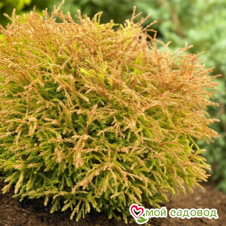 Туя Голден Таффет Данный сорт — декоративная карликовая разновидность западной туи. Слово «tuffet» в переводе с английского языка означает низкий округлый стул. Получен Голден Таффет в 1997 году в питомнике IseliNursery, размещённом в штате Орегон. Ботаническое описание Кустарник сформирован из двусторонних сплюснутых по бокам ветвей. Побеги тонкие, повисающие, короткие и достаточно гибкие. Чешуйчатая хвоя не прижата к веткам. Она выглядит ажурной и состоит из мелких иголок. Особую привлекательность растению придаёт золотисто-жёлтый оттенок. А вот у основания хвоя светло-зелёной окраски. Со временем концы иголок приобретают насыщенно жёлто-оранжевый тон. С приходом зимы он преобразуется в цвет тёмной бронзы. По всей длине хвойные чешуйки покрыты слоем воскового налёта. Голден Таффет — культура медленнорастущая. Годовалый прирост составляет максимум 12 см. По достижению возраста 10 лет диаметр кустарника равен 50 см. Саженцы, которым насчитывается 25 лет, достигают более 1 м в ширину и около 90 см в высоту. Ветви молодых экземпляров покрыты гладкой корой красно-бурого цвета. По мере взросления побегов она приобретает серо-коричневый оттенок. Плодоношение у туи начинается в 10 лет. На ветках образуются маленькие шишечки длиной до 8 мм. Это очень зимостойкая и теневыносливая культура, выдерживающая заморозки до -34 ºС. Однако иммунитет у Голден Таффет не слишком хороший. Декоративный кустарник подвергается атакам насекомых-вредителей (прежде всего, туевой ложнощитовки). Также растение боится грибковых инфекций. Ранней весной кустарник может пострадать из-за солнечных ожогов. Применение Высаживают туи Голден Таффет в небольших садах в восточном стиле, альпинариях, альпийских горках, на приусадебных участках и газонах (как одиночно, так и группками). Растения активно используются в роли контейнерного растения. Оно подходит для создания живого бордюра или низкорослой изгороди, оформления откосов и склонов, балконов, террас, крыш и лоджий. Такая туя хорошо смотрится в цветочных композициях с другими растениями. Хвойные чешуйки снабжены желёзками с целебным эфирным маслом, насыщенным фитонцидами. Агротехника Голден Таффет предпочитает хорошо освещённые участки. При этом полутень тоже подходит растению. Полностью затенённое место культура не переносит – есть риск потери плотности кроны и потускнения хвои. Рассада благополучно развивается на влажных, рыхлых и плодородных субстратах с уровнем кислотности в пределах 5 − 6 ед. Наиболее удачный вариант – суглинки или супесчаники. Посадку хвойной культуры проводят весной или ранней осенью. Между саженцами, изображёнными на фото каталога, оставляют интервал от 50 см до 3 м. Важно не заглублять корневую шейку — она должна размещаться на уровне грунта. Для полноценного роста рассады и сохранения декоративных свойств кроны необходимо придерживаться основных рекомендаций по уходу: своевременная прополка; проведение умеренных поливов прохладной, мягкой водой; профилактическая обработка ветвей препаратами, содержащими медь; дождевания кроны в засушливый период; ежегодная формирующая и санитарная стрижка кроны; рыхление и укрытие мульчёй почвы вокруг ствола; внесение минеральных подкормок весной и летом. Укрывают Голден Таффет на зиму, только если это молодые саженцы. В качестве теплоизоляц